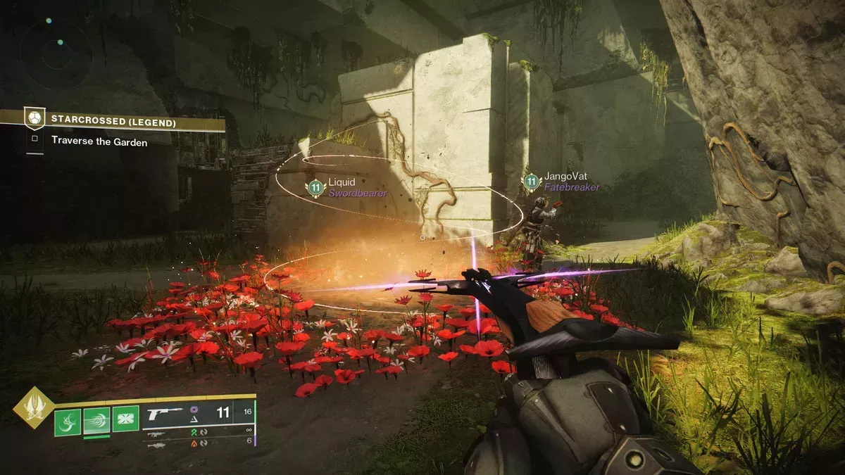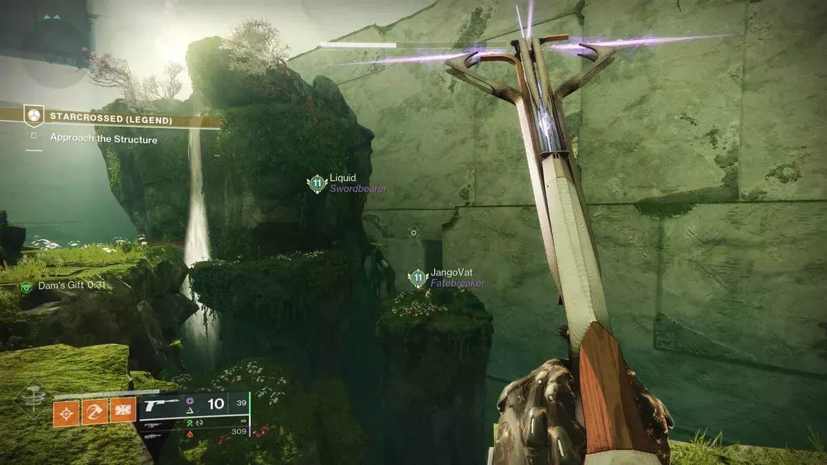 Cuando llegues a la primera zona exterior de la misión "Starcrossed" en Legend, avanza y mira a tu derecha. Encontrarás una gran roca verde. Si te fijas bien en la parte superior, verás un pilar blanco de luz que sale disparado. Salta hacia la gran roca verde y salta detrás de ella. Utiliza las partes naturales del acantilado para escalar la roca hasta llegar a la cima.