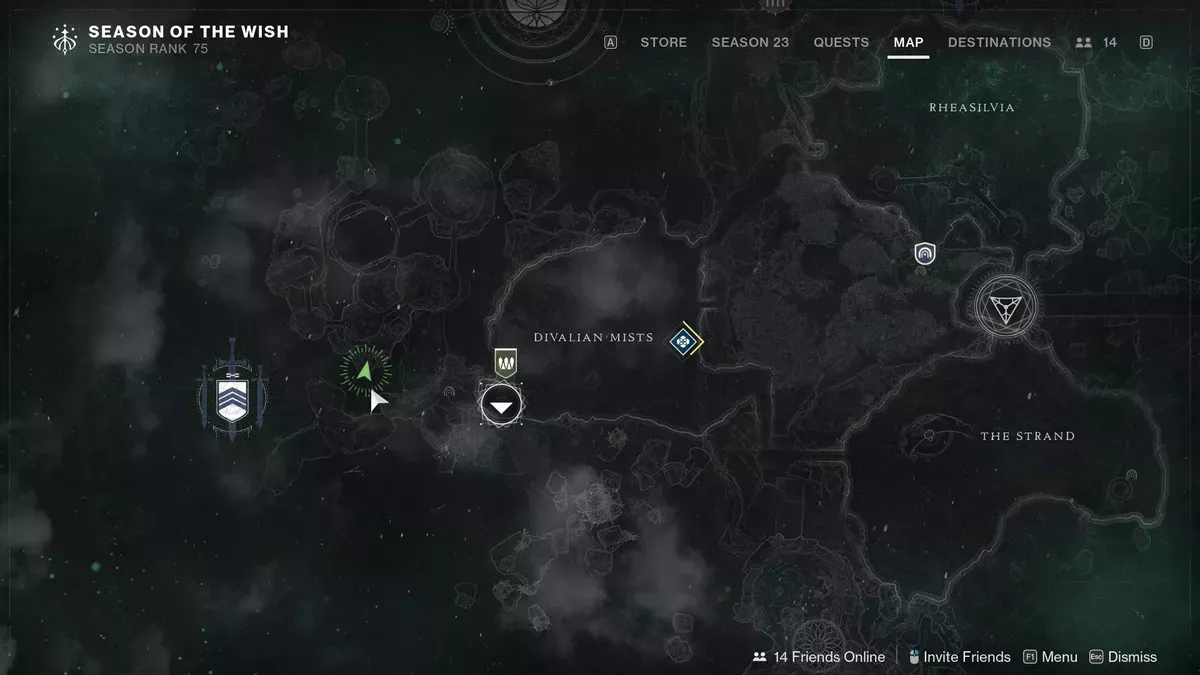 Una vez que aterrices en las Nieblas Divalianas, mantente a la izquierda y sigue el camino hacia el Espinazo de Keres (la parte más occidental del mapa). Dirígete a la espina dorsal, pero detente antes de llegar a la gigantesca catedral que alberga el Motor Oráculo. En su lugar, cuando llegues al patio que hay antes del Motor del Oráculo, dirígete a la izquierda y sube por el acantilado.