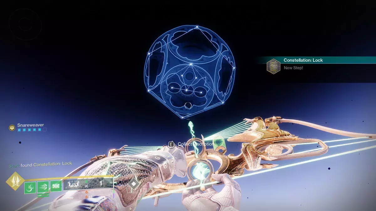 Una vez completado el conjunto de estrellas, tendrás que completar la misión "Starcrossed" en la dificultad Leyenda para conseguir el primer catalizador, que otorga al arco el potenciador "Enduring Snare", que hace que las trampas Snareweaver duren más.