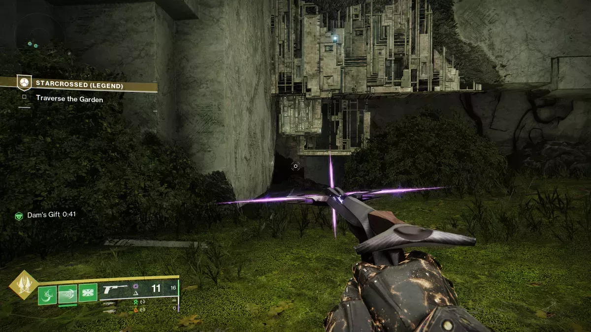 Continúa por la misión "Starcrossed" hasta completar el segundo encuentro y supera el puzle de salto después. Una vez que llegues a la zona con las grandes paredes grises y la hierba verde, continúa hasta la siguiente sala y encontrarás un charco que tiene el Regalo de Dam en su interior.