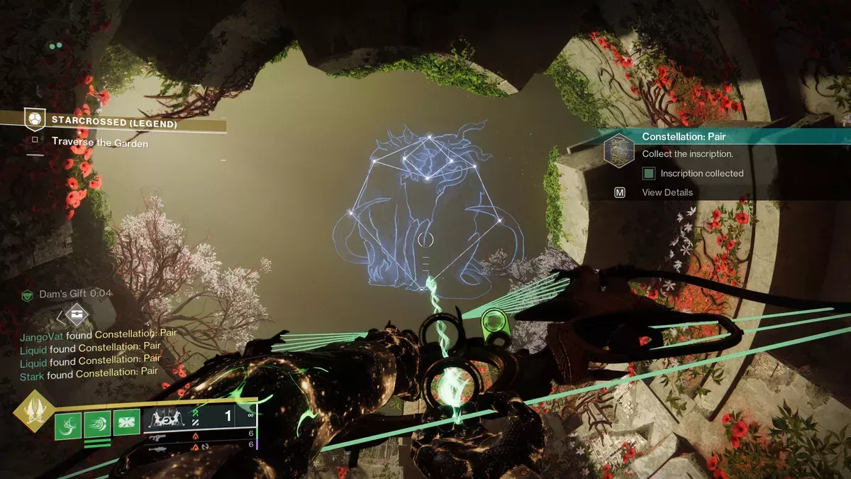 Una vez que reveles el mensaje, saca tu arco del Guardián de los Deseos y apunta al cielo. Dispara a las estrellas con el arco hasta acabar con la constelación de los dos dragones Ahamkara. Una vez que hayas visto la constelación, sal de la zona oculta y termina la misión "Starcrossed" en la dificultad Leyenda para conseguir tu Catalizador de Arma Vorpal.