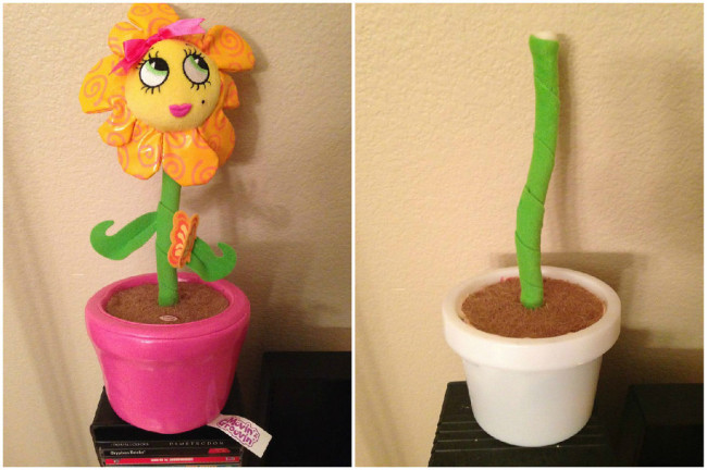 2) Construir tu propio Groot de 'Guardianes de la Galaxia'. ¿Cómo hacerlo? Primer paso: Comprar una de esas flores bailonas de plástico que venden en las ferias. Segundo paso: Quitarle el forro y sustituirlo con tela y cordel marrón. Tercer paso: Modelar una cabeza con masilla y pintarla para que encaje con la tela. Aquí tenéis el resultado, abajo del todo la fotografía con cada uno de los pasos.
