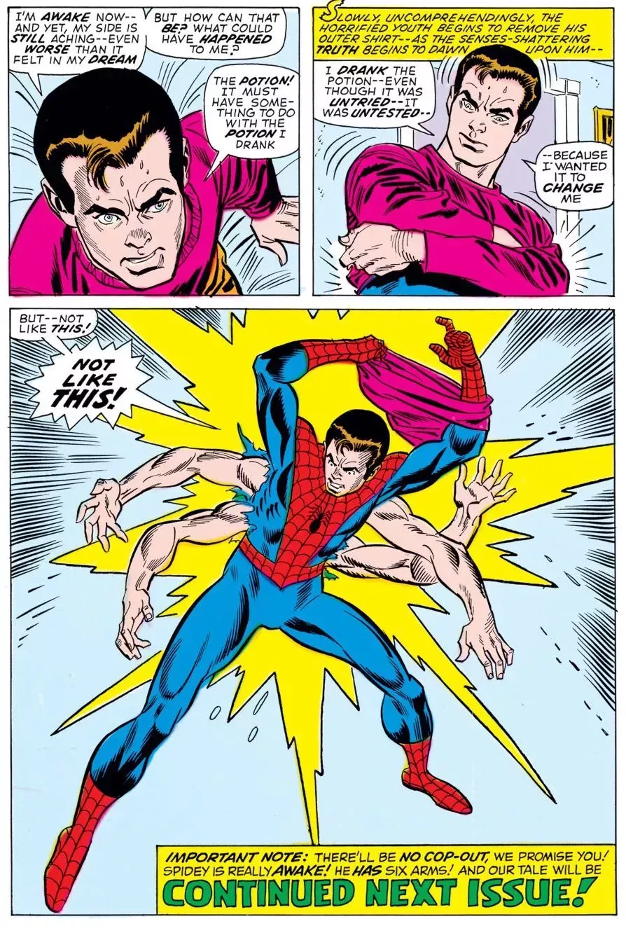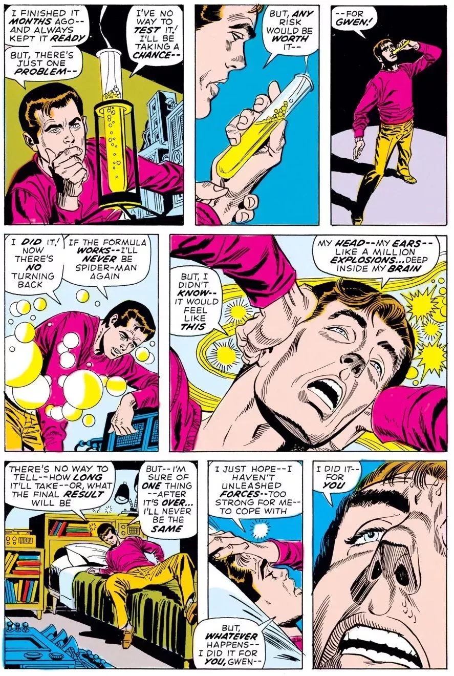 En Amazing Spider-Man #100, Peter probó una poción que supuestamente le quitaría su poder arácnido (ya que, de lo contrario, su sentido de la responsabilidad sería demasiado grande como para ignorar ser un héroe si tuviera poderes).