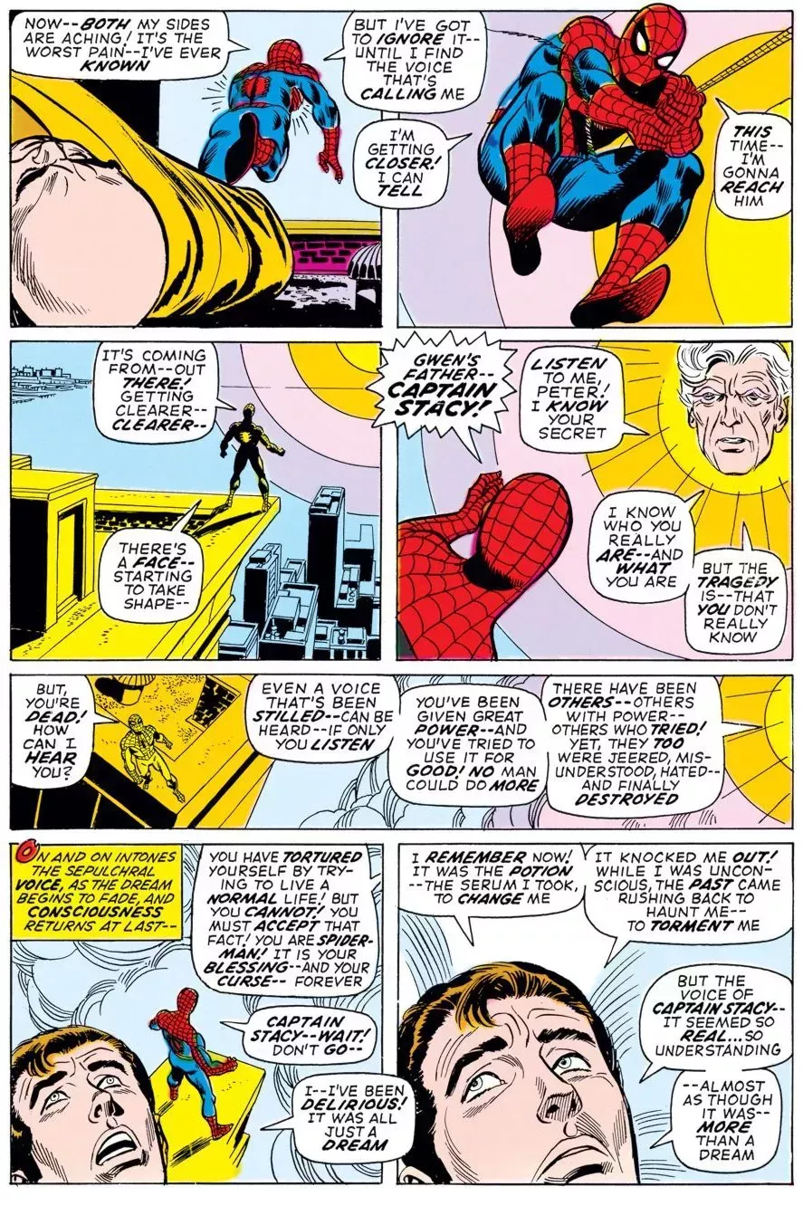 El suero le hace alucinar batallas con todos sus grandes enemigos antes de que finalmente se dé cuenta de que tiene que seguir siendo Spider-Man. Curiosamente, la voz en su cabeza que realmente le empuja a tomar esa decisión es la del capitán George Stacy, el padre de Gwen, que había muerto poco menos de un año antes. Resulta fascinante que en aquella época, el tío Ben obviamente importaba a Spider-Man, pero no tenía el mismo impacto que normalmente se asocia con él hoy en día. En su lugar, era el Capitán Stacy quien ocupaba ese papel...