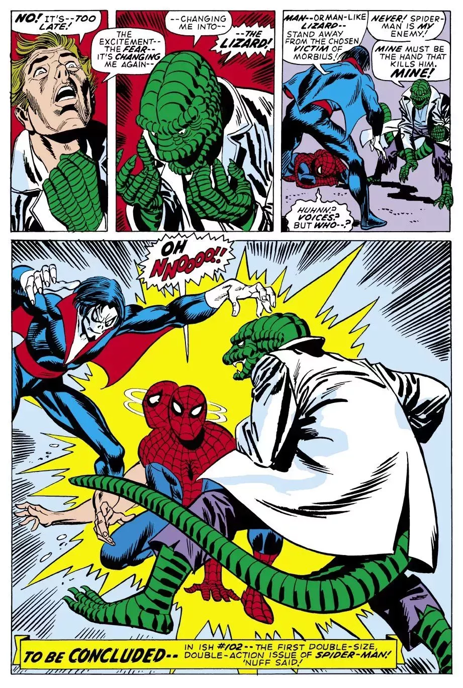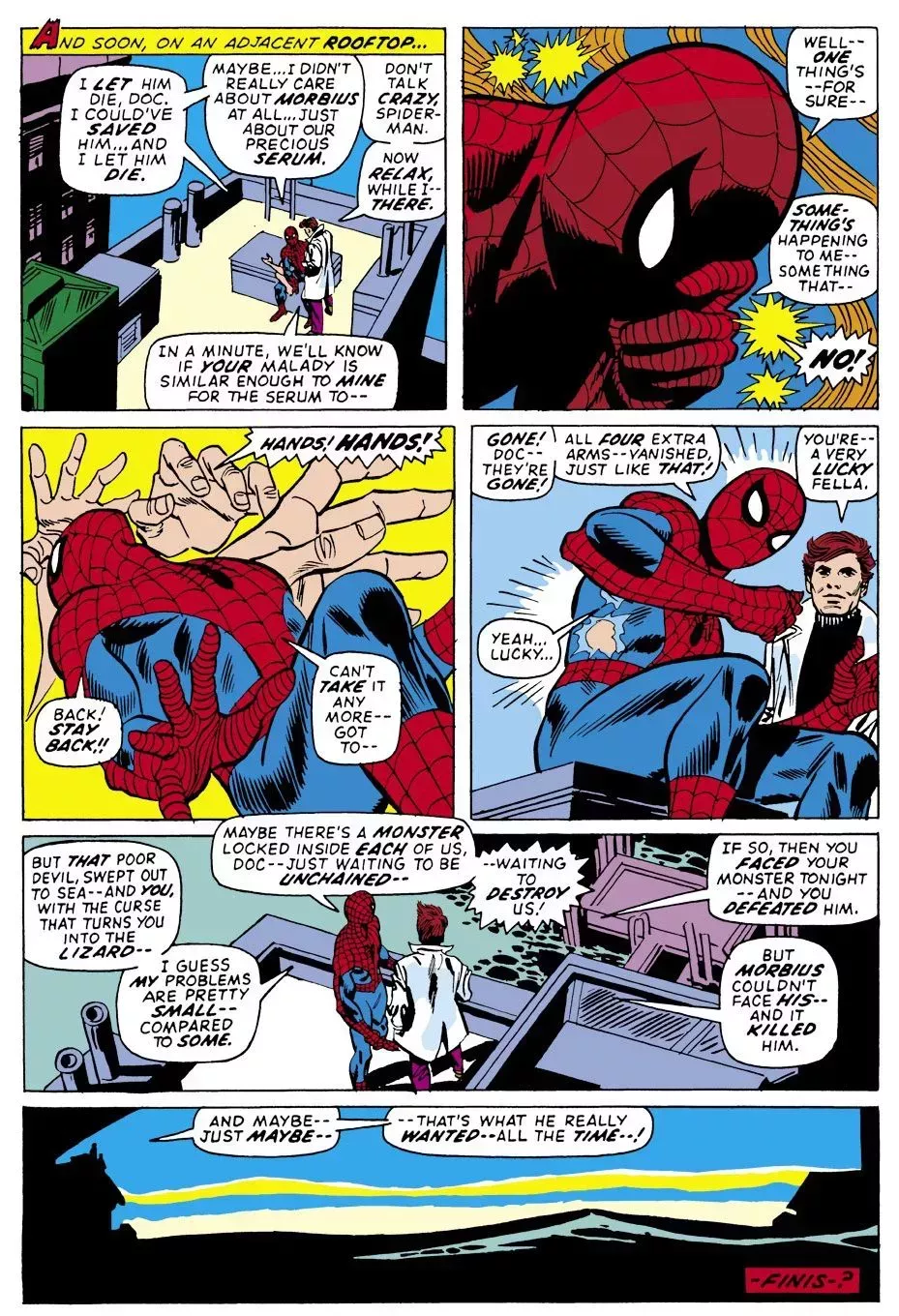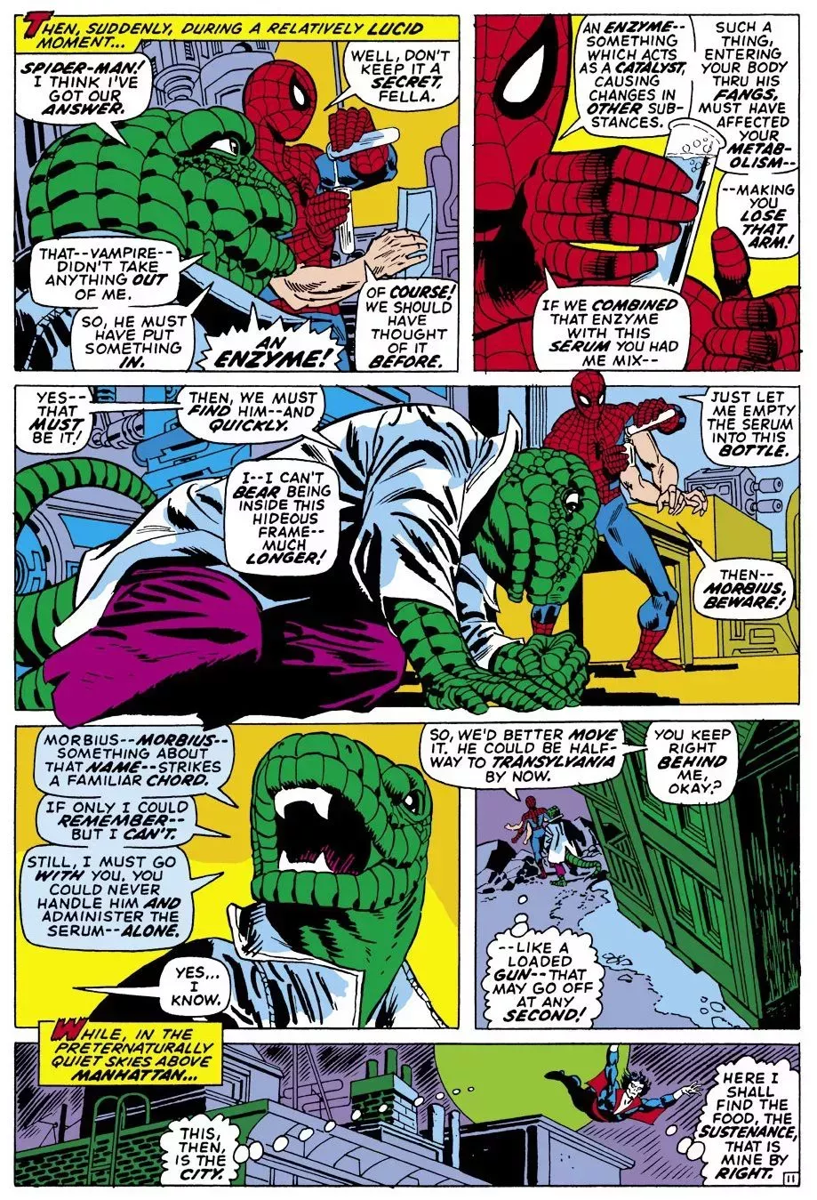 Bien, en el siguiente número, Morbius gana la pelea, pero justo cuando clava sus colmillos en el Lagarto, Spider-Man lo persigue y Morbius decide: "Eh, me iré a atormentar a toda una ciudad llena de gente de la que me puedo alimentar. Gracias, Spiderman".