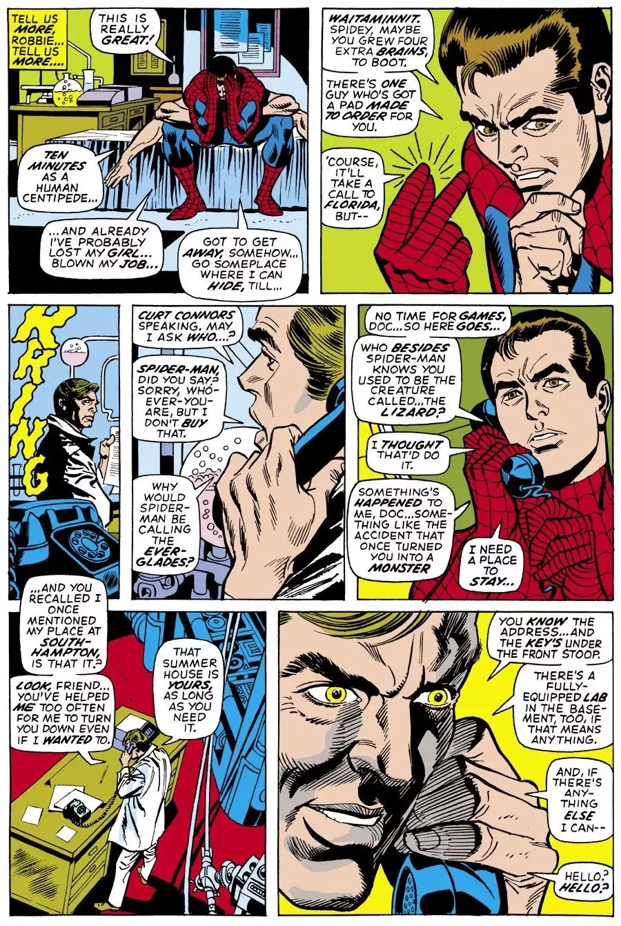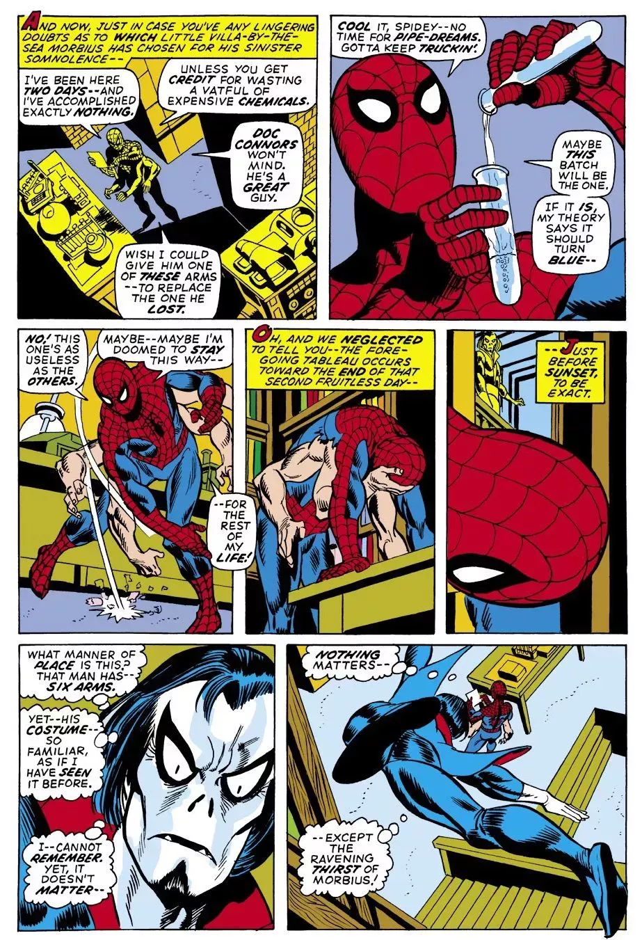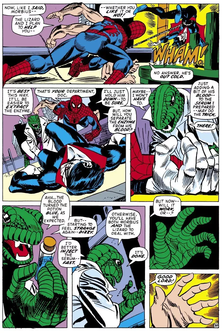 ¿CÓMO RESOLVIÓ MORBIUS, DE ENTRE TODOS, EL DILEMA DEL BRAZO EXTRA DE SPIDERMAN?Bien, en Amazing Spider-Man #101, Thomas se hace cargo del libro temporalmente y su primer curso de acción fue sacar a Spider-Man de la ciudad. Por suerte, su viejo amigo Curt Connors (el científico que se convirtió accidentalmente en el villano Lagarto) ayudó a Spidey con un préstamo de su casa de la playa de Long Island (que por suerte también venía con un laboratorio que Spidey podía usar para ayudar a arreglar el lío en el que se había metido)...