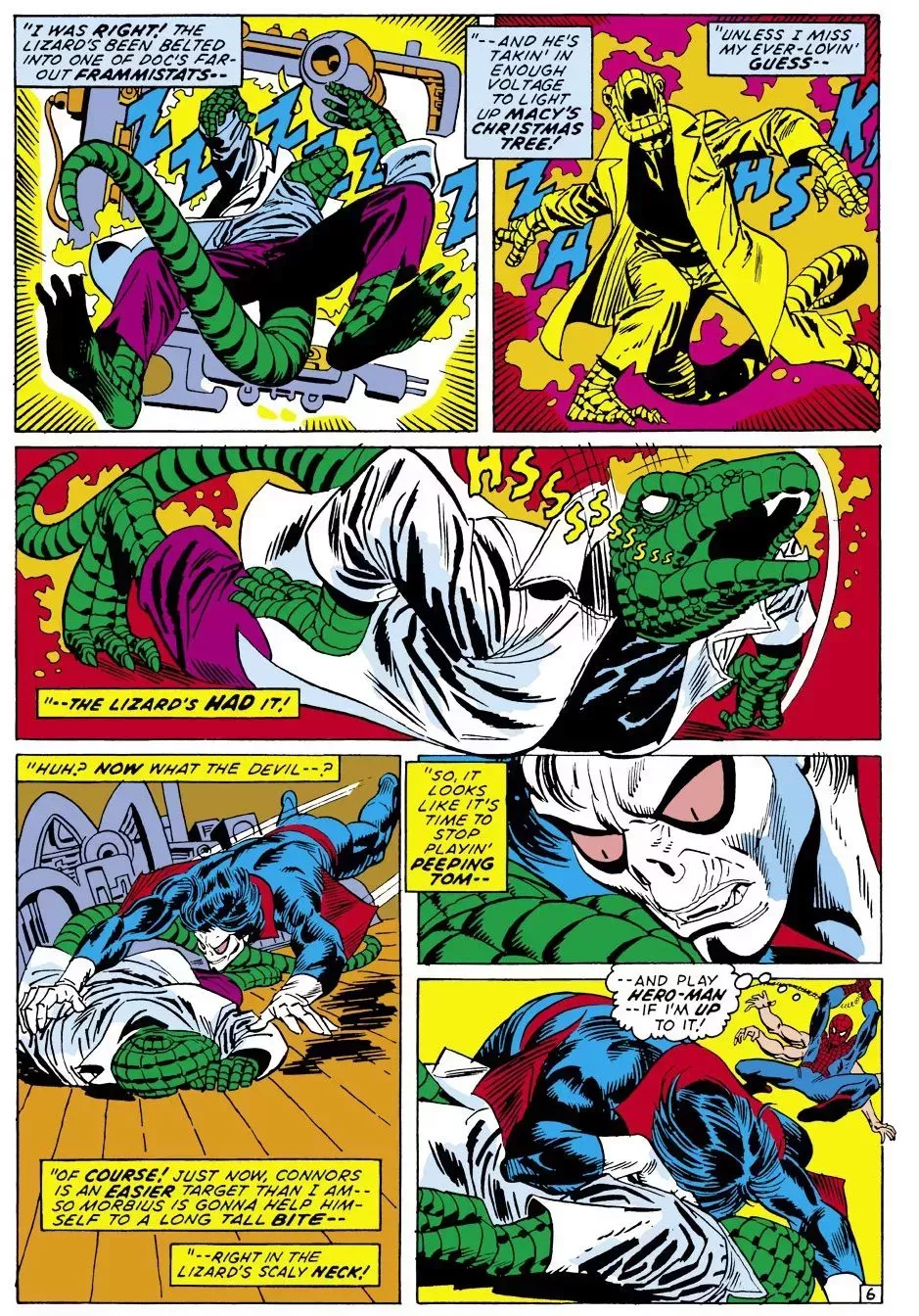 Persiguen a Morbius (mientras los flashbacks nos informan del trágico origen de Morbius, un científico de buen corazón que se convirtió en un vampiro viviente) y, efectivamente, tras conseguir la enzima de él, el Lagarto vuelve a convertirse en Connors...
