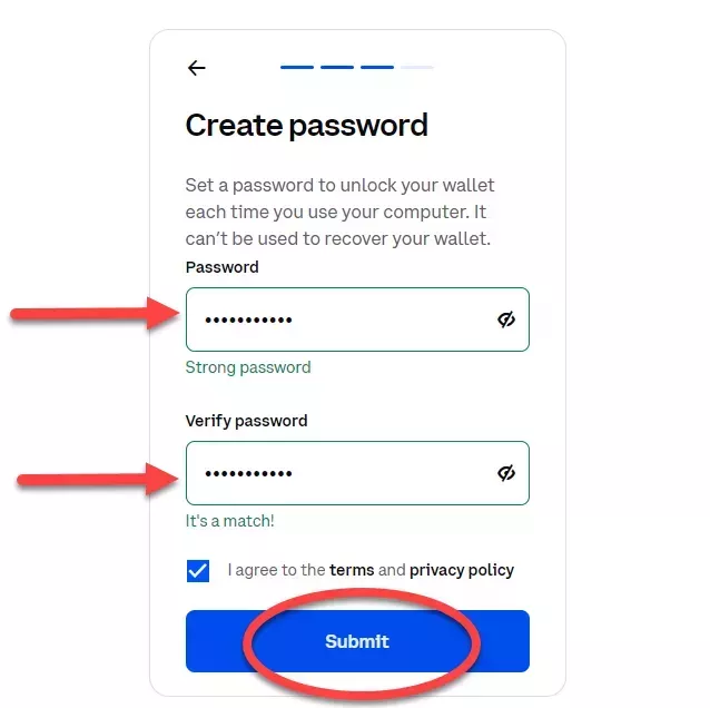 - El siguiente paso es crear una contraseña para su cuenta. Introduzca la contraseña, verifíquela, acepte las condiciones y pulse el botón "Enviar".