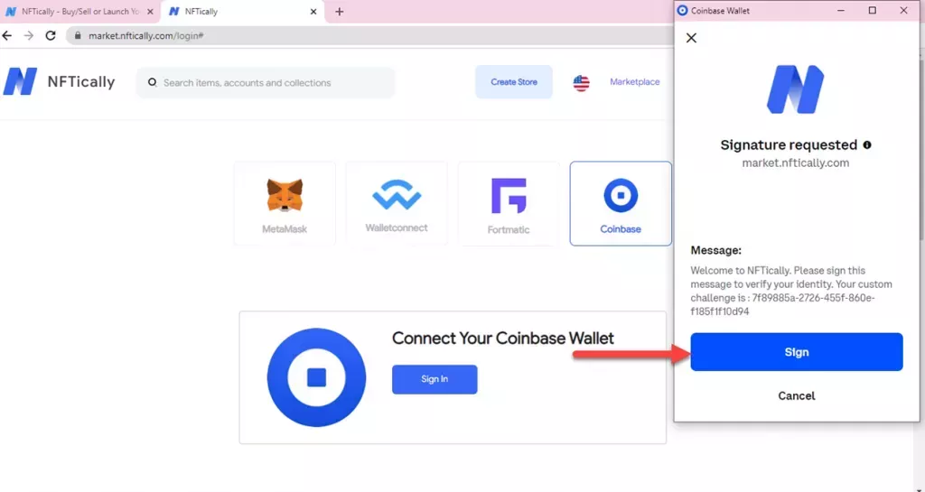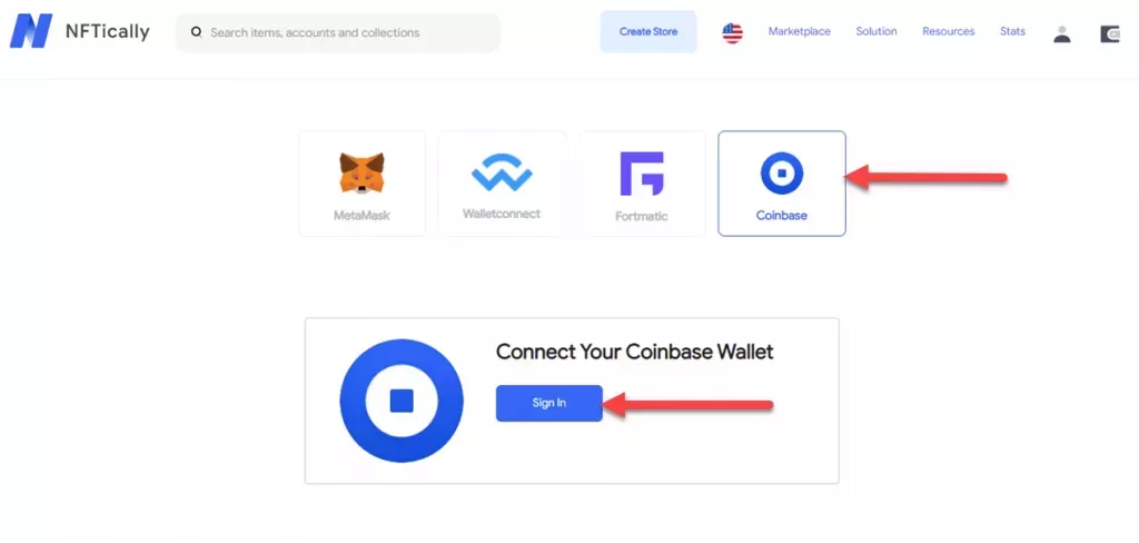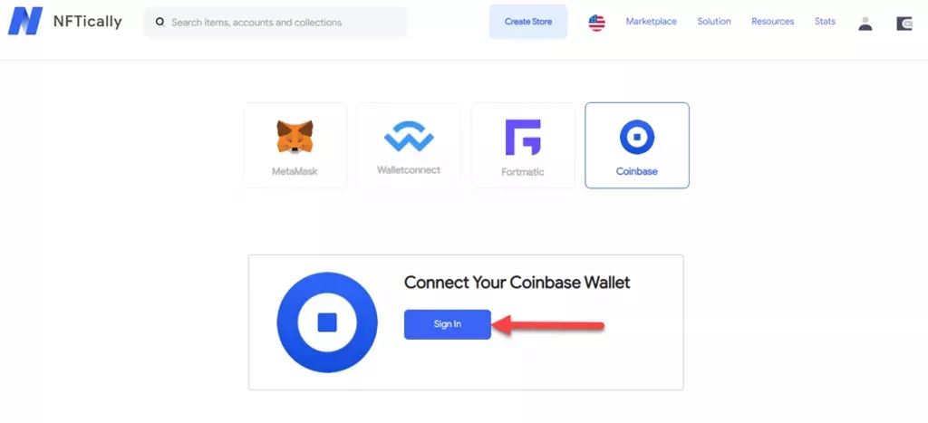 - Ahora, vuelve a la página de inicio de sesión de NFTICALLY, selecciona Coinbase y haz clic en el botón "Iniciar sesión".