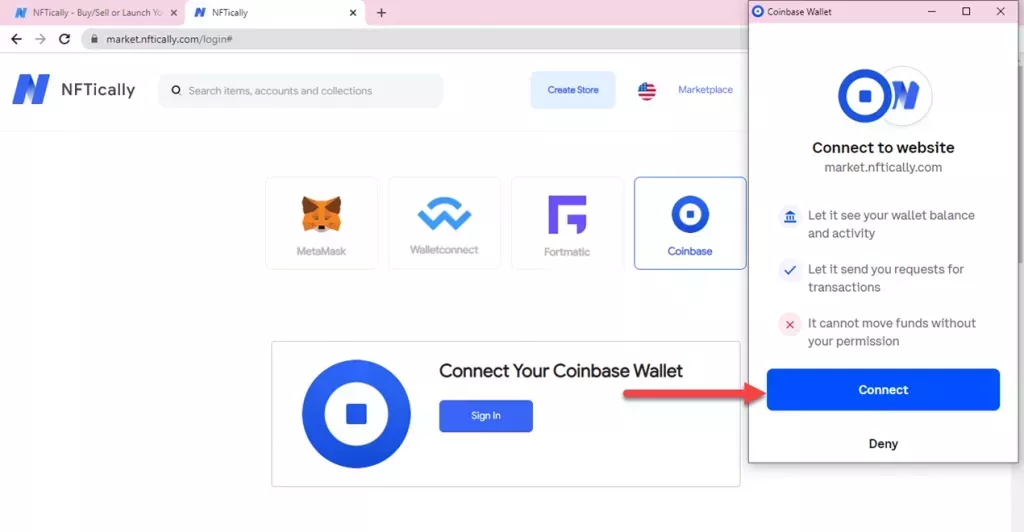 - Una vez que hayas pulsado el botón de inicio de sesión, aparecerá una ventana emergente de Coinbase que te pedirá que conectes tu cuenta a NFTICALLY. Haz clic en el botón "Conectar" para seguir adelante.