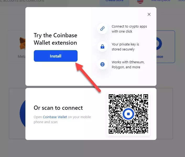 - Después de hacer clic en el botón "Iniciar sesión", aparecerá una ventana emergente que le dará la opción de instalar Coinbase como una extensión para su navegador o podrá escanearla directamente desde su teléfono móvil si ya la tiene en él.