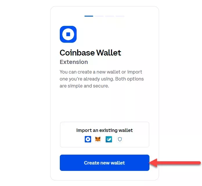- Una vez que la extensión se haya añadido correctamente, te llevará a la página de la extensión de Coinbase, donde se te pedirá que crees un nuevo monedero. Crea en la pestaña "Crear nuevo monedero" resaltada en azul en la parte inferior de la página.