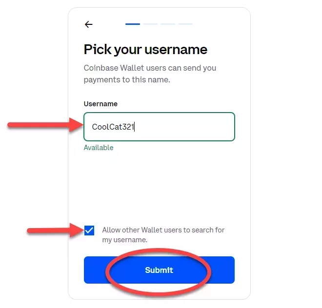 - El siguiente paso es dar un nombre de usuario para su cuenta de monedero. Introduzca el nombre de usuario. Puedes marcar la casilla en la parte inferior para permitir que otros te busquen usando tu nombre de usuario. Pulsa el botón "Enviar" para seguir adelante.