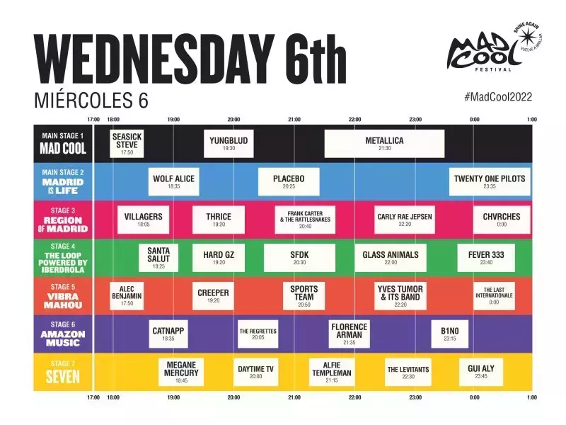 Seasick Steve y Alec Benjamin serán los primeros en actuar, subiendo ambos a sus escenarios -el escenario principal del Mad Cool y el escenario Vibra Mahou, respectivamente- a las 17:50 horas del miércoles. Metallica tendrá la actuación más larga de la noche -y, evidentemente, de todo el festival- con un set de dos horas de duración, de 21:30 a 23:30, en el escenario Mad Cool.
