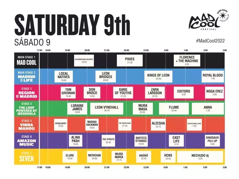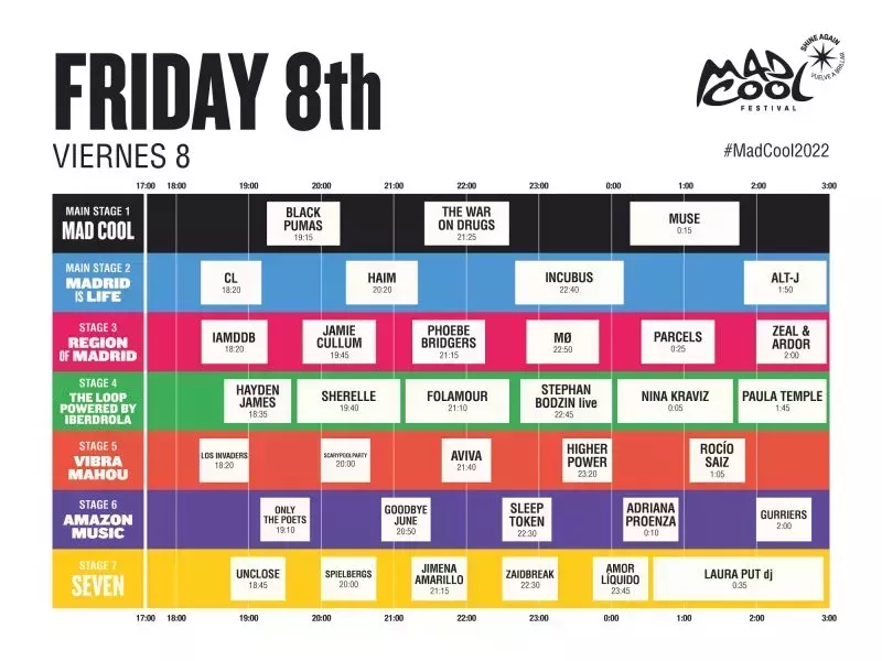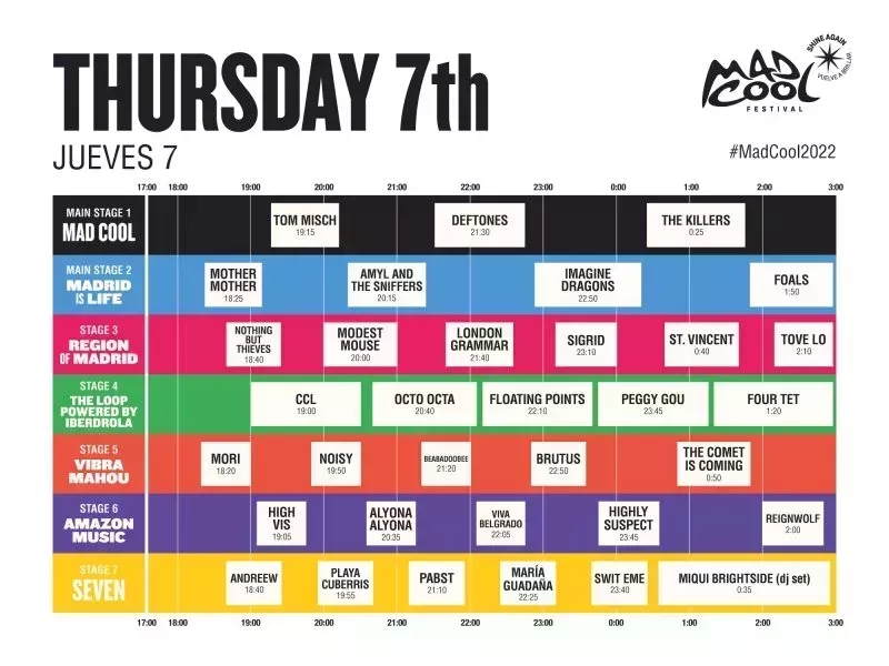 Las tres noches siguientes tendrán una duración de dos horas más, comenzando un poco después de las 6 de la tarde y terminando a las 3 de la madrugada. El jueves (7 de julio), el cartel del escenario Mad Cool incluirá a Tom Misch, Deftones y The Killers, mientras que el escenario adyacente Madrid Is Life acogerá a Mother Mother, Amyl And The Sniffers, Imagine Dragons y Foals.