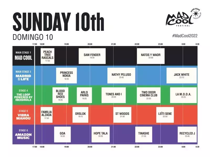 El domingo (10 de julio) ofrece un itinerario reducido, sin programación en el escenario Siete y con una hora de cierre a las 12:30 horas. Jack White cerrará el escenario Madrid Is Life, tras las actuaciones de Nathy Peluso y Princess Nokia, mientras que Peach Tree Rascals, Sam Fender y Natos Y Waor actuarán en el escenario Mad Cool. La M.O.D.A. (en el escenario The Loop) y Recycled J (en el escenario Amazon Music) se enfrentarán a White como últimas actuaciones.