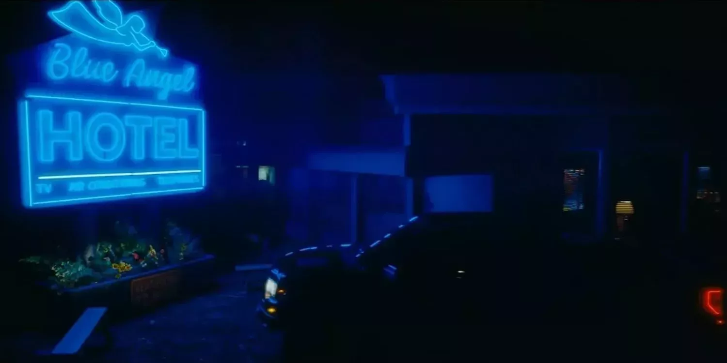 Strange Darling no es sólo brillante. Está bien iluminada, es vibrante y rebosa vida. En cada plano hay al menos un color primario -rojo, amarillo, verde o azul- que atrae inmediatamente la mirada. Las macetas y las flores de la idílica casa de campo de los montañeses son rojas, amarillas y verdes. La Dama y el Demonio destacan con sus vívidas ropas rojas mientras caminan por un soleado bosque de verde follaje y suave luz amarilla. El sórdido motel en el que comienza la acción está bañado por la luz azul del letrero de neón, con toques rojos en el parterre y en la peluca carmesí de la Señora, que rompen la unidad monocromática. A medida que aumenta la violencia, la Señora y el Demonio dejan un rastro de destrucción roja en un mundo amarillo y verde, por lo demás soleado y alegre.
