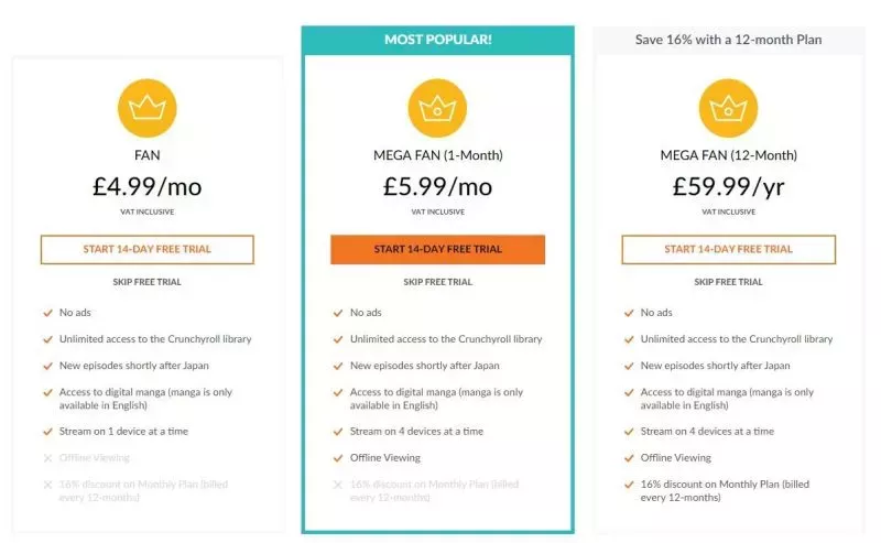 Una vez agotada la prueba gratuita, Crunchyroll Premium está disponible en dos niveles en el Reino Unido. La opción más barata es la suscripción "Fan" por 4,99 libras al mes (7,99 dólares en EE.UU.), que da acceso a todos los programas sin anuncios en un solo dispositivo, junto con la biblioteca digital de manga.
