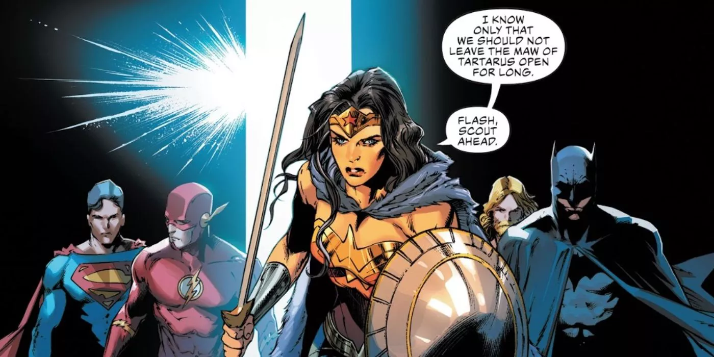 Después de llegar a Themyscira para intentar llegar al Tártaro y encontrar a Jim Corrigan, el único ser que puede contener el poder del Espectro y evitar que corrompa a más del mundo en su furia, la Liga de la Justicia se encuentra rodeada por las Amazonas. A pesar de los esfuerzos de la Mujer Maravilla, no es capaz de llegar hasta su pueblo, ni siquiera cuando llega su madre Hippolyta. Pronto, las Amazonas atacan a la Liga de la Justicia por haber traído hombres a la isla. Linterna Verde se ofrece como voluntario para quedarse y mantener a las Amazonas ocupadas, así que deja el mando del equipo en manos de la Mujer Maravilla. Rápidamente ordena al equipo que atraviese la puerta y entre en el inframundo, con la Liga literalmente preparada para seguirla hasta el infierno y volver.