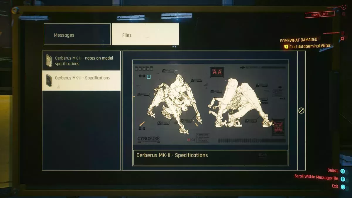 Hasta aquí, todo normal; nada fuera de lo común para el mercenario más solicitado de Night City. Es durante la misión "Algo dañado" cuando el juego se desvía bruscamente hacia el horror, introduciendo un desafío que no puede derrotarse de forma convencional. El adversario: El Cerebus MK-II, una aterradora araña-mecánica experimental inmune al daño balístico, a los ataques rápidos o a las ocurrencias. El Cerebus tiene predilección por arrastrarse ruidosamente dentro y fuera de los conductos de ventilación mientras grita cosas imprecisas y amenazadoras, y agarra al jugador para mostrarle el final de sus muchos, muchos brazos perforadores.