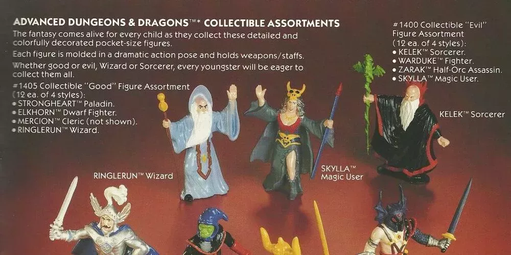 En 1982, LJN sacó una línea de 19 figuras más 7 criaturas. La línea consistía principalmente en varios guerreros y caballeros, junto con varios magos, elfos y enanos. Se incluyeron monstruos icónicos como Tiamat, el dragón de cinco cabezas, el temible horror de los garfios e incluso un dragón de cobre montable como enemigos de las figuras de aventureros, y varios monstruos flexibles de PVC y un conjunto de juguetes de cuerda completaron la línea. La joya de la corona de toda la colección era la Fortaleza de los Colmillos, un set de juego de un metro de altura lleno de trampas y artilugios ocultos.