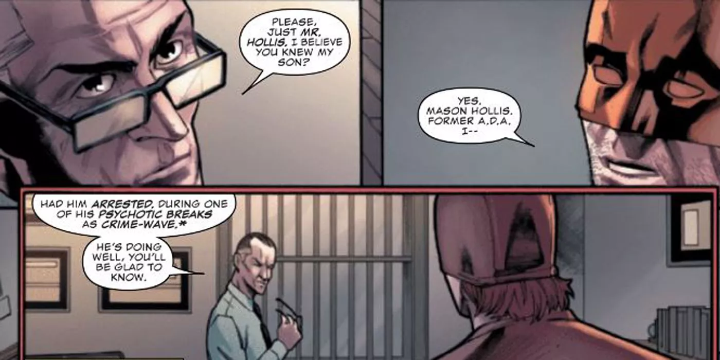 El recluso también le dijo a Daredevil que sabÃa que saldrÃa antes de tiempo, a pesar de que éste le dijo que pensaba cumplir toda su condena de dos años y que no querÃa ser tratado de forma diferente a los demás. Cuando los guardias llegaron y los separaron, informaron al recluso de que tendrÃa que continuar su discurso más tarde porque el alcaide querÃa verlo. Daredevil se dio cuenta de que tenÃa un verdadero enemigo en la cárcel: el propio alcaide. Cuando Daredevil admitió que no querÃa un trato especial, el alcaide se presentó como el señor Hollis. Daredevil se dio cuenta de que se trataba del padre del antiguo fiscal Mason Hollis, el villano conocido como Crime-Wave. Daredevil ayudó a encerrar a su hijo, y Hollis informó a Daredevil de que serÃa llevado ante la justicia, al igual que su hijo.