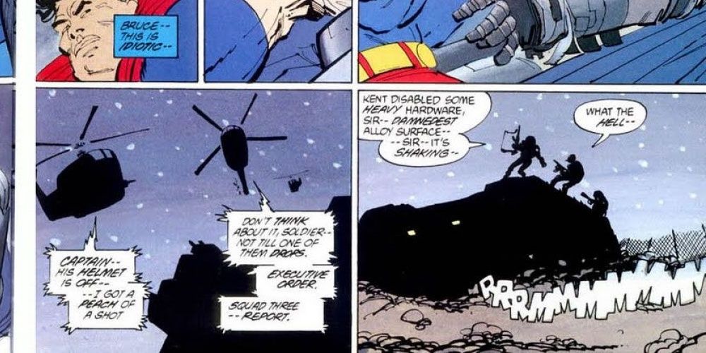 Batman es el hombre que siempre tiene un plan, así que estaba preparado para Superman. Sin embargo, Superman no vino solo; se le unieron destacamentos del ejército estadounidense, incluyendo helicópteros de combate. Superman sabe que Batman hace muchos planes, así que podría haber dejado fácilmente que los helicópteros hicieran el trabajo.