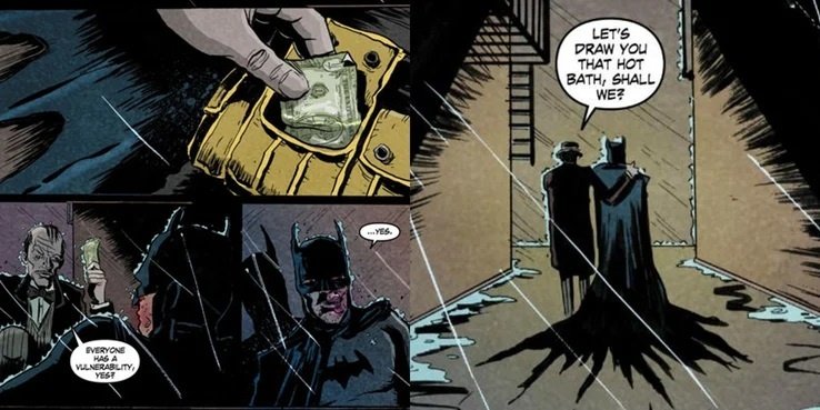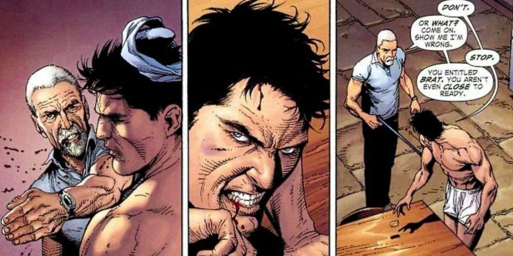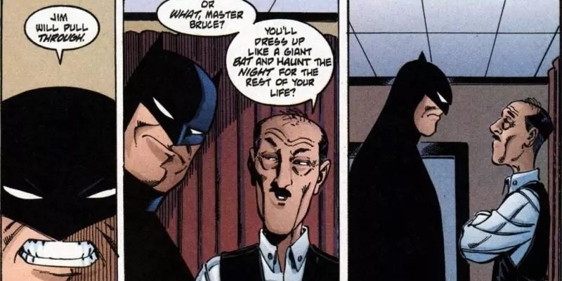 Bruce entonces carga a Alfred contra una pared, pero Alfred, siendo un ex soldado, lanza una serie de golpes para poner a Bruce en su lugar, todo mientras enumera las debilidades de Batman: "¿Sin armas? ¿No hay reconocimiento? ¿Sin tácticas? ¿Sólo un estúpido disfraz de murciélago? ¿Una capa inútil? "