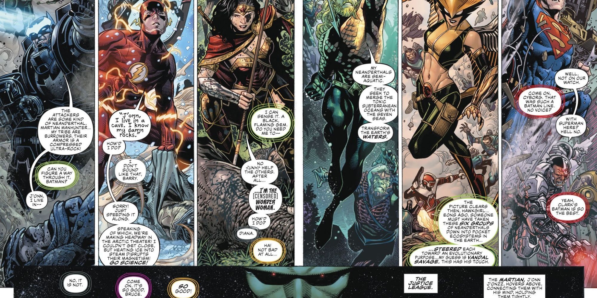 A pesar de este hecho, la Liga de la Justicia se mostró muy animada a la hora de afrontar la crisis. A través del enlace telepático establecido por el Martian Manhunter, muchos miembros de la Liga de la Justicia hicieron sus mejores imitaciones de la voz gruñona de Batman. Bruce no hizo ningún comentario al respecto, pero parecía muy poco divertido.