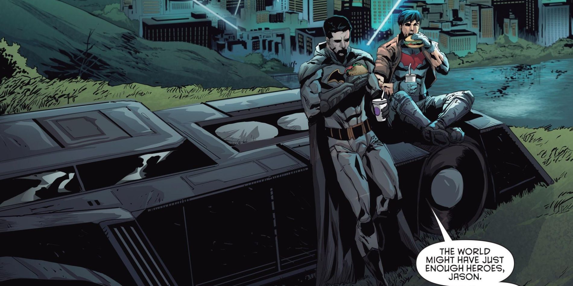 Al final, Batman ofreció el perdón a Jason tras los recientes conflictos, y Bruce ofreció consuelo a Jason por la pérdida de su amigo en Red Hood: Outlaw #27 de Scott Lobdell y Pete Woods.
