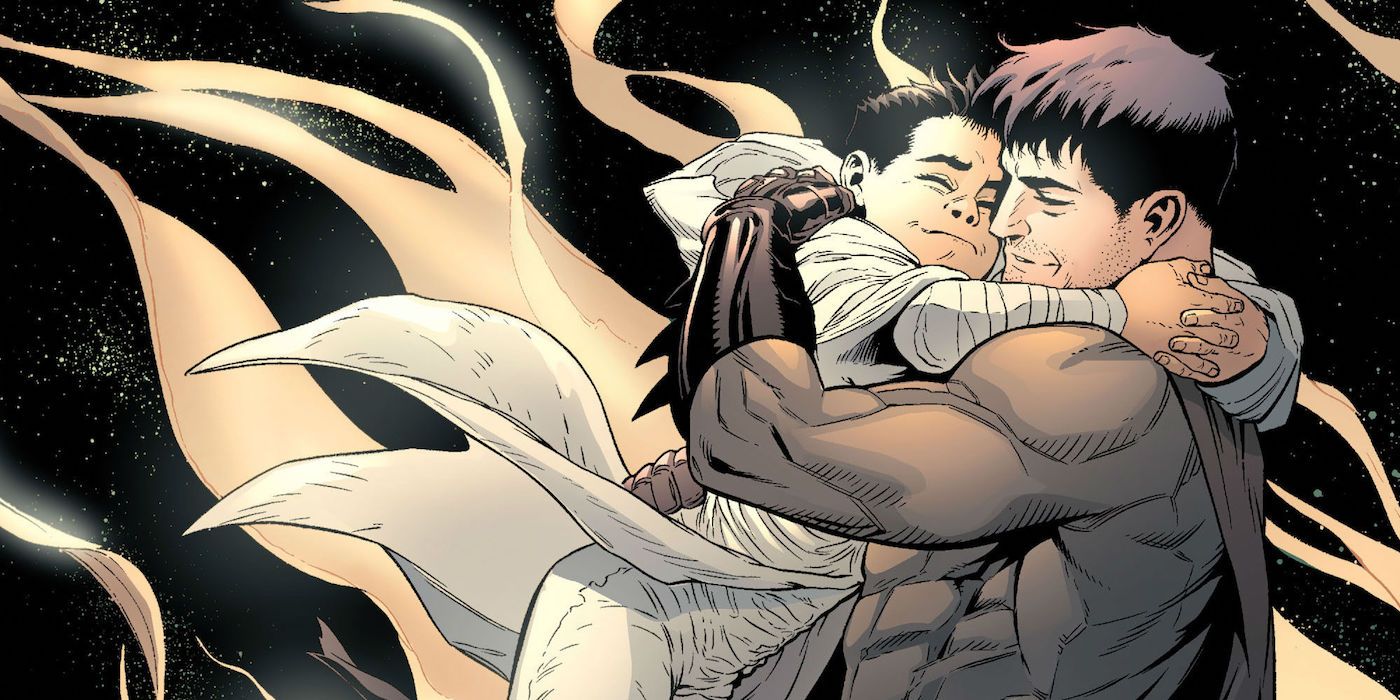 Cuando Robin reaparece en la Batcueva, Batman abraza inmediatamente a su hijo delante del resto de la asombrada Familia Batman.
