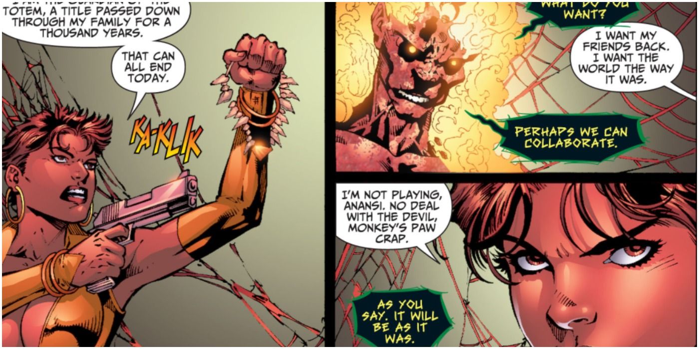Dentro del Tótem, el propio Anansi reveló que era el responsable del cambio de sus poderes, queriendo ponerlos a prueba. Posteriormente, Anansi alteró sus historias para que nunca iniciaran la JLA. Vixen escapó y reunió a sus aliados para enfrentarse al Dios Arlequín, pero fueron superados. Sin otra alternativa, Vixen apuntó con un arma al Amuleto, cuya destrucción habría acabado con todo, obligando a Anansi a devolver las cosas a la normalidad.