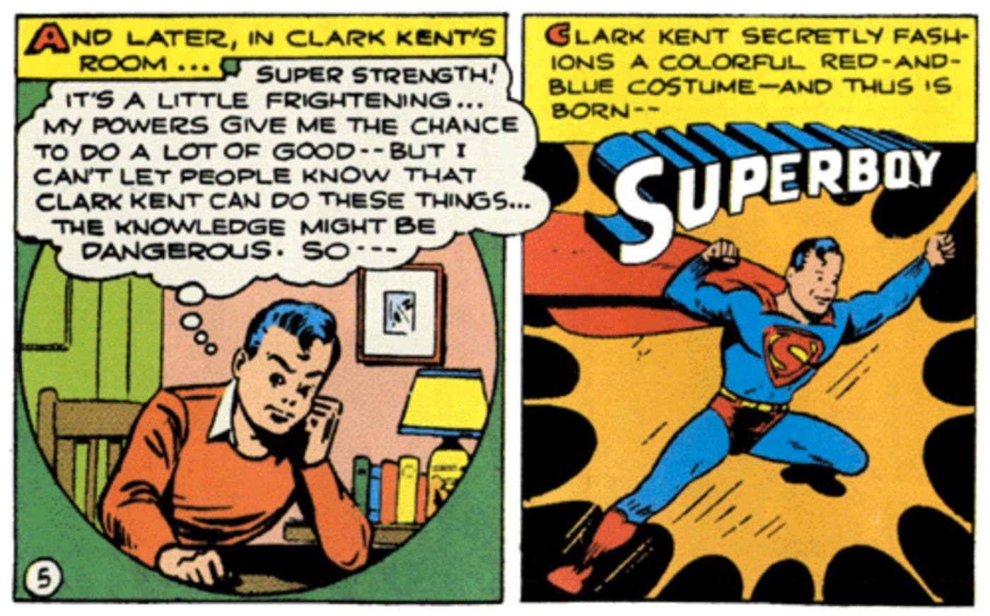 El primer disfraz de Superboy es en realidad de la narración de Superman a una edad temprana. En ese momento, Connor no había sido introducido en el universo DC, así que los escritores simplemente escribieron que tendría sentido con el personaje en ese momento.