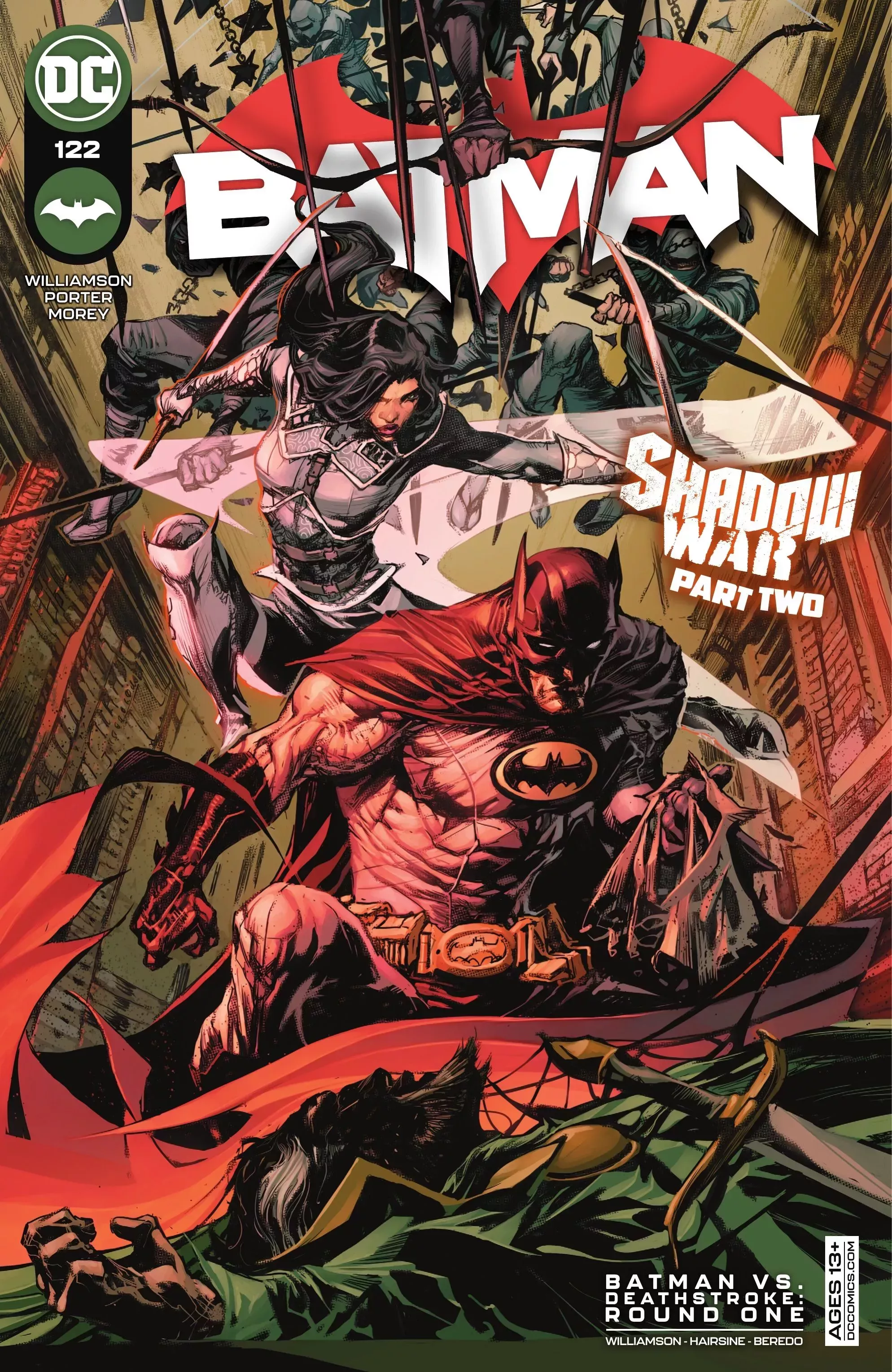 El número 122 de Batman prepara el terreno para un evento lleno de acción, ya que el crossover de tres meses de duración está en marcha. Desde el principio, es evidente que el arco de la Guerra de las Sombras busca sacudir el statu quo lo suficiente como para hacer nuevos cambios en el universo DC. Este número actúa como trampolÃn para que esas ideas se hagan realidad, introduciendo a los jugadores en el tablero y familiarizando a los lectores con la situación actual del mundo. El guionista Joshua Williamson inunda el libro con una abundancia de acción que serpentea entre los momentos de reflexión, creando una narrativa triple. La historia se mantiene estancada, a pesar de los presagios de la inminente fatalidad, y no se mueve por las intensas secuencias de lucha. Con Batman atrapado en medio del conflicto, la subtrama del misterio del asesinato da un ángulo de suspense al libro. Las últimas páginas del número muestran el primer encuentro entre Deathstroke y Batman, también escrito por Williamson, que es tan explosivo como la historia principal.