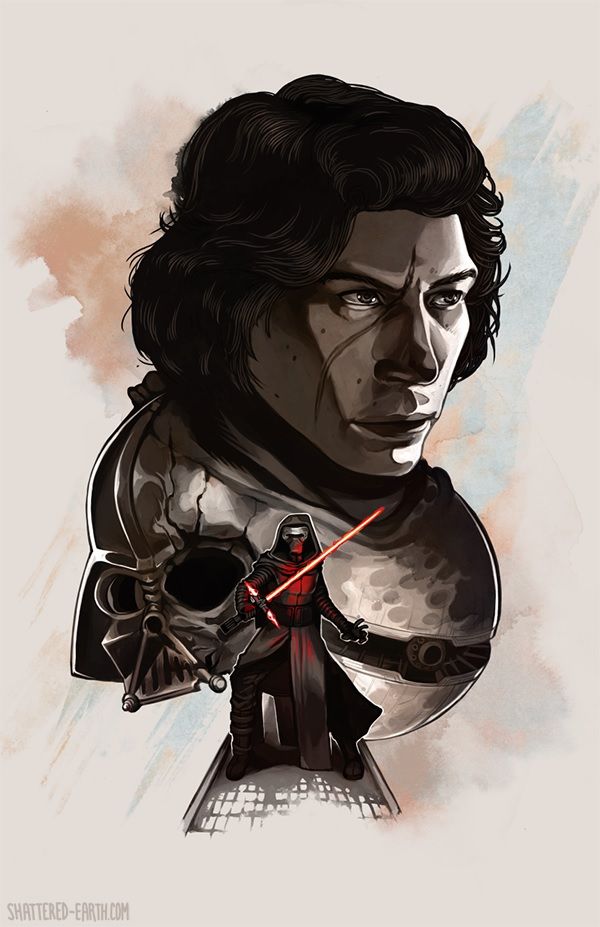 Si nos preguntas, el fan art de Tierra Destrozada de Kylo Ren se parece al póster de una película de terror de La Fuerza Despierta. A estas alturas, sabemos muy bien la conexión entre Kylo Ren/Ben Solo y Darth Vader, pero es divertido pensar en esto como un teaser en 2015.