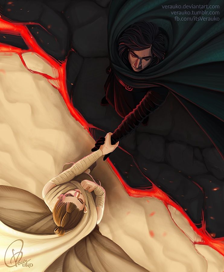 Esta eterna lucha se inmortaliza primero en Luke Skywalker y su padre Darth Vader, y luego en el nieto de Vader, Kylo Ren, y en la nieta de Palpatine, Rey. En este llamativo fan art, la luz y la oscuridad chocan... pero también encuentran un terreno común, en cierto modo. Su relación es compleja, por decir lo menos, y el artista Verauko lo capturó todo en una escena elegante.