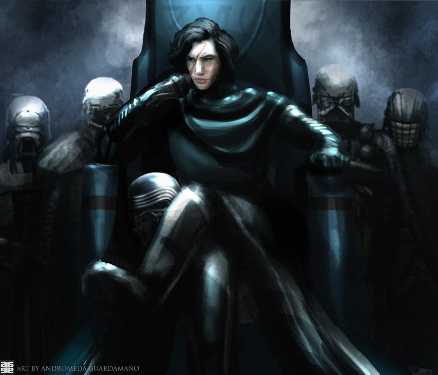 El artista está ansioso por mostrarnos a Kylo Ren cómodo como su líder, como un Palpatine en miniatura, y los Caballeros están listos para luchar. Pero a diferencia de los Caballeros con casco, podemos ver la cara de Kylo, y nos preguntamos si esa es una mirada de arrepentimiento que empieza a cruzar su rostro. ¡Podría ser!