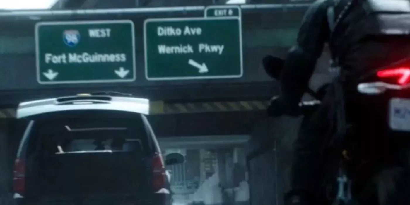 La secuencia de acción principal, que presenta flashbacks a lo largo de la película, ofrece algunos de esos guiños, como señales de la calle y salidas de la autopista, que proporcionan huevos de pascua para los fans. La mayoría de ellos son fáciles de detectar de inmediato, pero algunos pueden requerir una segunda mirada. Ed McGuinness es uno de los ilustradores que trabajó en el personaje, mientras que Paul Wernick es uno de los guionistas de la película. Steve Ditko no participó en este personaje en particular, pero el peso pesado del cómic es uno de los creadores de Spider-Man, uno de los compañeros favoritos de Deadpool en los cómics de Marvel. Los tres nombres aparecen en señales de carretera en la película.