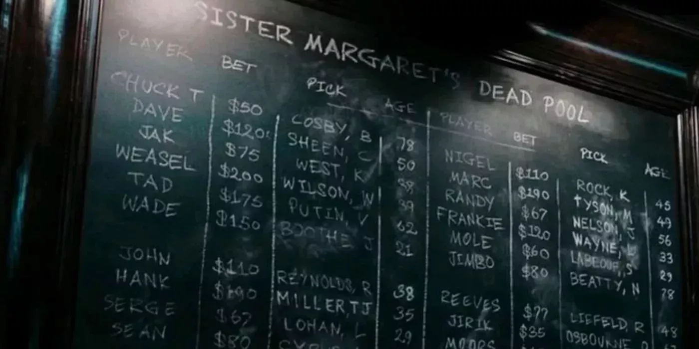 Es probable que un aficionado pueda captar algunos de los nombres de la pila de muertos en la pizarra de Sister Margaret. Sin embargo, la gran cantidad de nombres hace que sea necesario pausar y volver a ver la imagen para captarlos todos.