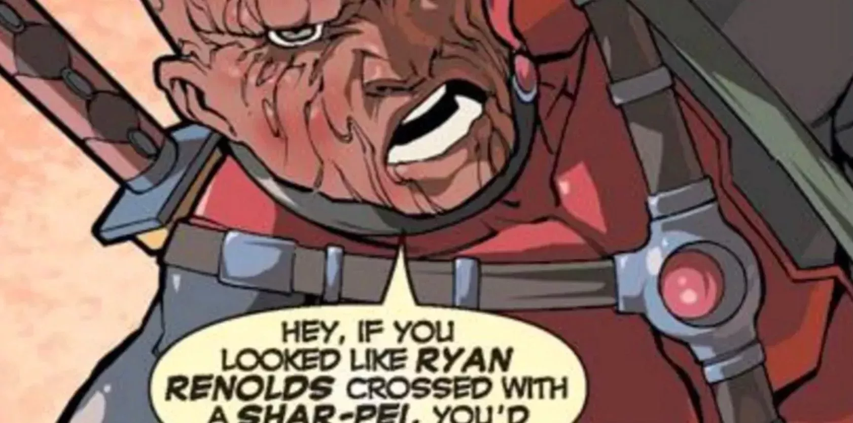 En un cómic de Deadpool de 2004, el personaje principal menciona algo similar. Se describe a sí mismo como un cruce entre Ryan Reynolds y un sharpei. Esa frase supone una especie de presagio de la vida real del actor, ya que fue años antes de que interpretara al personaje.