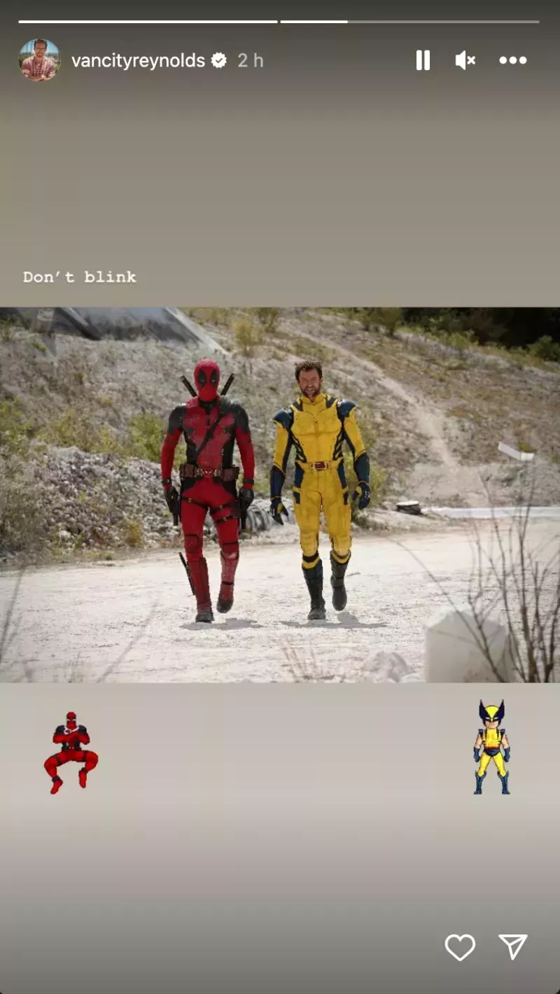 "No parpadees", escribió Reynolds en sus Stories, compartiendo una foto de Jackman junto a él mismo como Deadpool.
