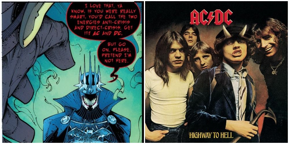 En referencia a una de las mayores bandas de rock 'n roll de todos los tiempos, The Batman Who Laughs sugiere que se llame Anti-Crisis y Direct-Crisis, o AC/DC. Esto no es sólo un saludo al nombre de la banda, sino también a las teorías de los fans sobre el significado del nombre.