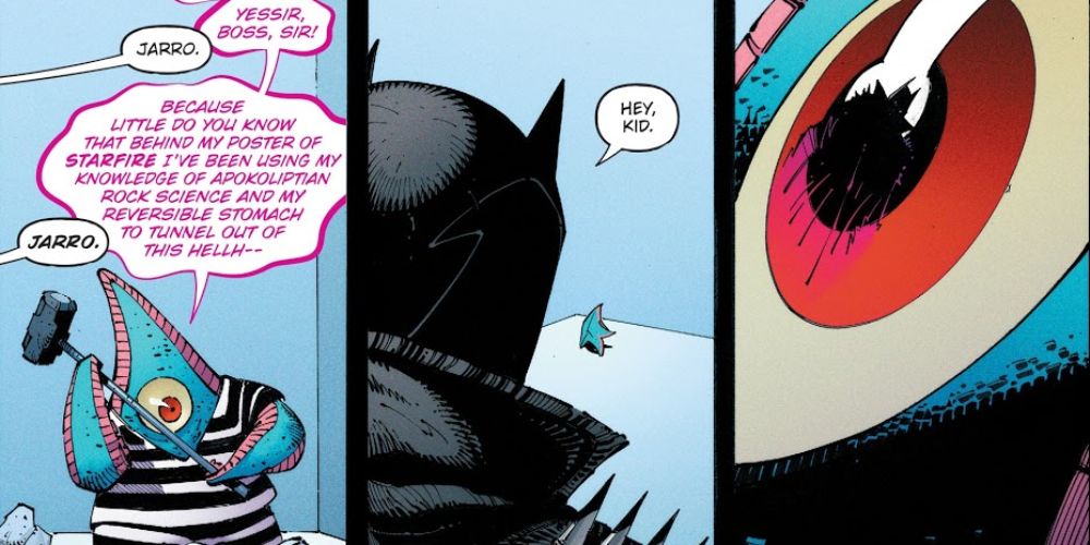 Mientras todos los demás en la prisión en forma de caja están en sus trajes habituales de superhéroes, Jarro está en una esquina con las clásicas rayas de prisión de los dibujos animados, rompiendo piedras con un mazo y haciendo referencia al póster de Rita Hayworth de The Shawshank Redemption-aunque Jarro utiliza un póster de Starfire para ocultar su ruta de escape.