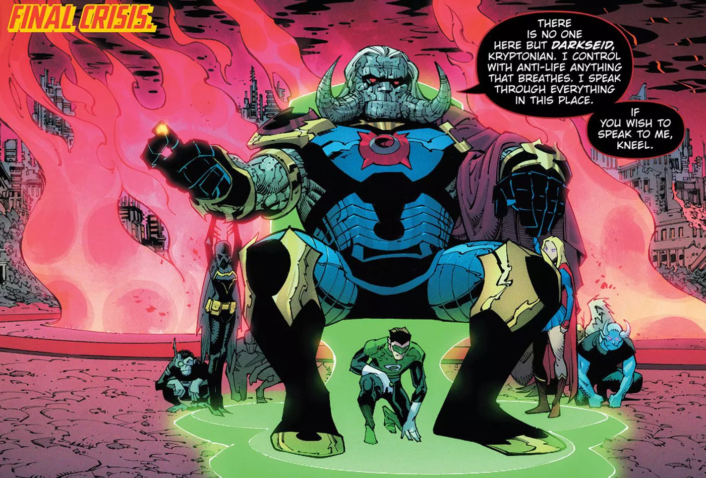 Después de su batalla final con su hijo Orión en Crisis Final, Darkseid cayó a la Tierra, causando una grieta en el propio universo. Mientras estaba en la Tierra, Darkseid y sus agentes se dedicaron a debilitar el planeta lo suficiente como para que todo cayera bajo el hechizo de la Ecuación Anti-Vida. Aunque tuvo éxito durante un tiempo, ya que la mayorÃa de la humanidad se convirtió en una extensión de su voluntad y una Mujer Maravilla controlada por la mente que servÃa como su cazadora principal, los héroes fueron capaces de superar sus planes y destruir su forma fÃsica. Sin embargo, Superman y una colección de otros héroes multiversales fueron necesarios para destruir su esencia, lo que llevó a una batalla final con la segunda amenaza del evento, Mandrakk el Monitor Oscuro.