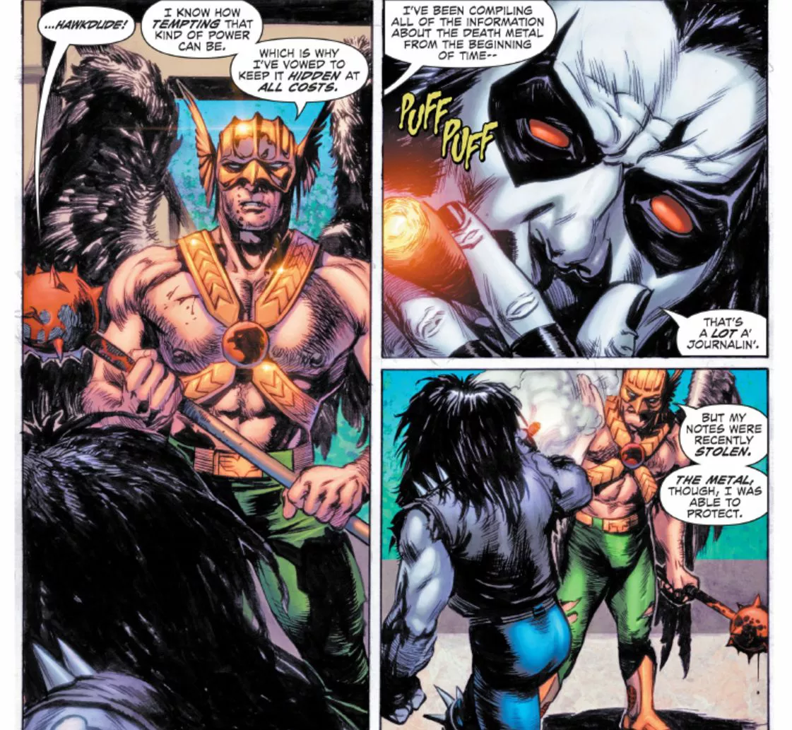 Esto es lo que hace que la escena de Death Metal: Infinite Hour Exxxteme #1 sea tan sorprendente. Lobo está siendo agresivo y antagonista de Hawkman, pero el héroe alado se aleja de Lobo después de ser amenazado. Hawkman ha ido tras la gente por mucho menos. Después de que Lobo amenaza con golpearlo con su propia maza, Hawkman sólo admite que no siempre puede mantenerla escondida y entrega una de las sustancias más poderosas del Multiverso a un personaje que es salvajemente inestable en sus mejores dÃas.