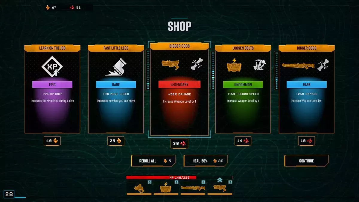 Durante mis primeras rondas, me tomé mi tiempo para encontrar el equilibrio y no me preocupé demasiado por avanzar. Este es un juego en el que mueres pronto y a menudo, y eso forma parte de la diversión. Cada vez que morÃa, volvÃa al menú principal, donde podÃa desbloquear nuevas mejoras permanentes con los recursos obtenidos durante mi última partida. La siguiente vez que caÃa, era más fuerte, más rápido y más sabio. Con el tiempo, también pude jugar con las otras clases: artillero, ingeniero y perforador.