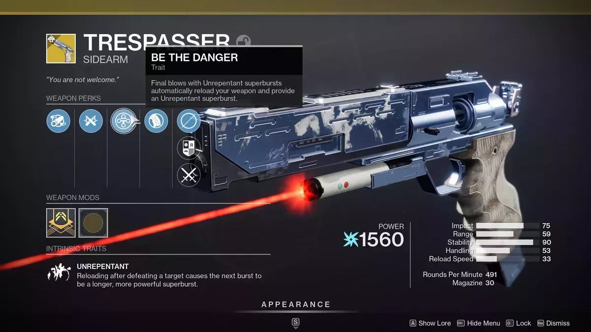 El Trespasser, un exótico que regresa del original, ha experimentado algunas mejoras. Su pericia exótica es Impenitente, que hace que las recargas después de los asesinatos hagan que la siguiente ráfaga de Trespasser sea más larga y mucho más potente (llamada súper ráfaga). La cualidad secundaria Ser el Peligro hace que las muertes con la ráfaga más larga recarguen instantáneamente tu arma y carguen otra súper ráfaga.