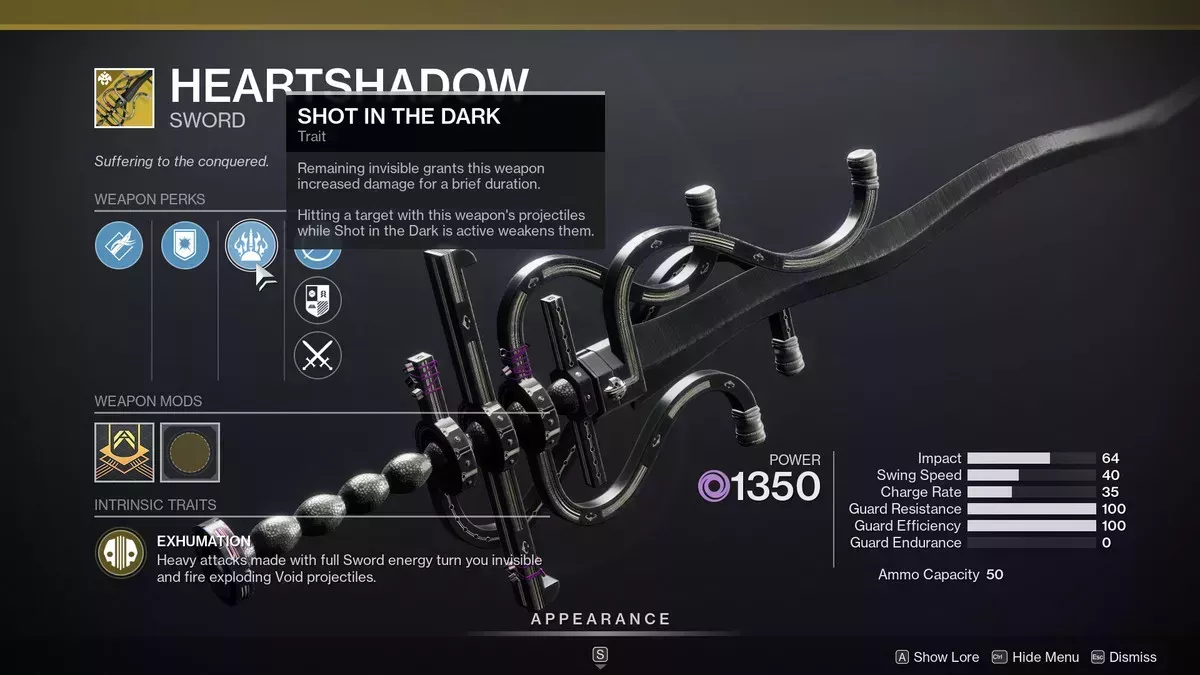 Su pericia exótica es Exhumación, que hace que los ataques fuertes con toda la energía de la espada vuelvan invisible al Guardián y disparen proyectiles explosivos del Vacío. Su pericia secundaria es Disparo en la oscuridad, que otorga a Heartshadow una bonificación de daño si su usuario permanece invisible durante un periodo de tiempo prolongado. El uso de los proyectiles en este estado de bonificación debilita al objetivo.