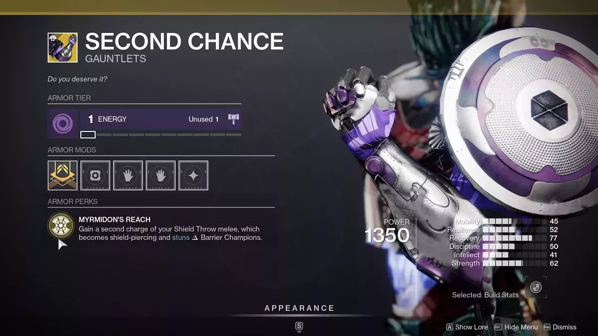 Segunda oportunidad aumenta a los Titanes del Vacío. Su pericia exótica es Alcance de mirmidón, que permite que el lanzamiento de escudo cuerpo a cuerpo atraviese la barrera de los campeones. También otorga dos cargas a Lanzamiento de escudo.