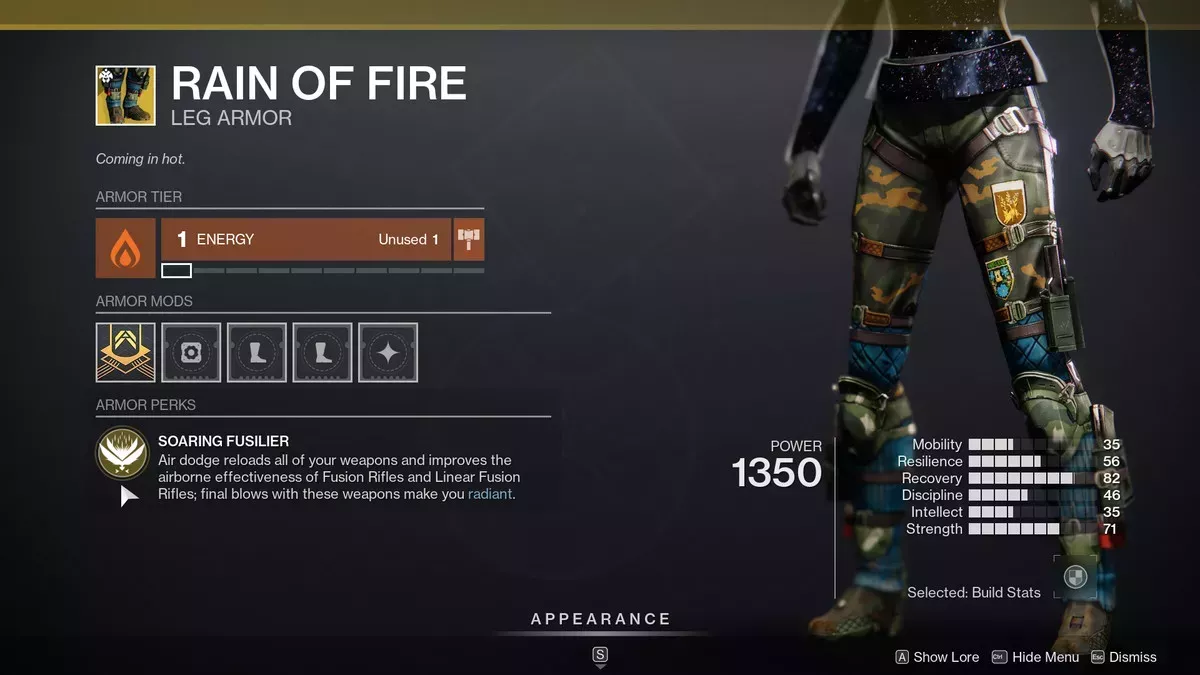 Lluvia de fuego aumenta los brujos solares. Su pericia exótica es Fusilero volador, que hace que las esquivas aéreas recarguen todas las armas y mejora la eficacia aérea de los rifles de fusión y los rifles de fusión lineales. Los golpes finales con rifles de fusión y rifles de fusión lineales otorgan a los Guardianes la mejora radiante.